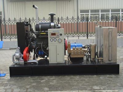 頭,氣缸進氣壓力0.4 MPa ? 進水兩級過濾粗濾:Y型過濾器 200μ 精濾:不銹鋼過濾器 50μ 前置泵:增壓加過橋球閥控制? 底盤式油箱:容積600升,可以方便用戶現場使用不銹鋼過渡水箱:容積220升,裝有液位計。? 電控系統:采用PLC設計,可對柴油機的轉速、機油壓力、水溫、電壓、累計工作時間進行自動顯示和報警。 電控系統還對進水壓力,出水壓力以及泵的潤滑油溫度進行自動顯示和報警:當進水壓力低于0.1 MPa時,系統自動卸荷。當出水壓力高于140 MPa時,系統自動停機。當潤滑油溫度超過70℃時,系統進行聲光報警。